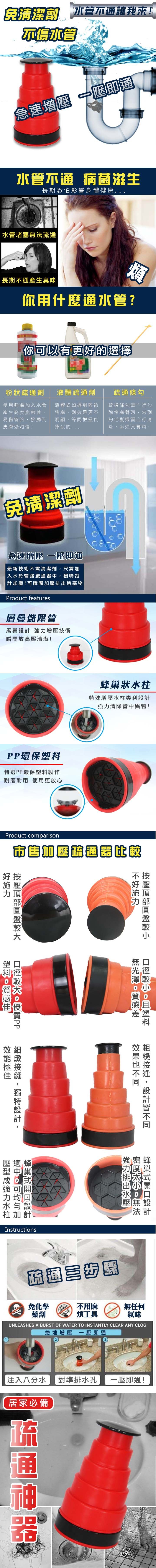 免用清,不水管,急速增,一即通,特殊增蜂巢水柱利,只需加水到管路疏通器中,可瞬加排出堵塞物