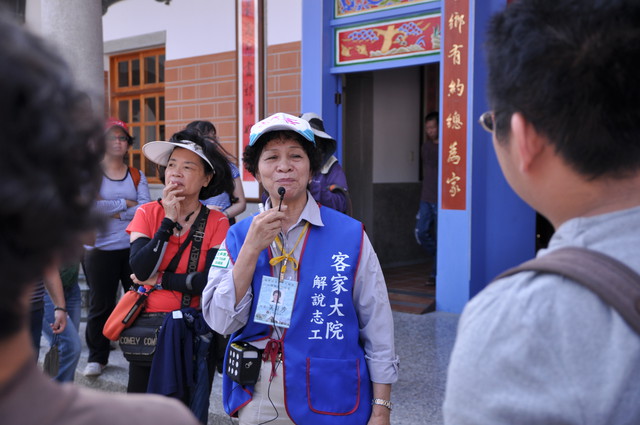 客家大院正牌匾依古制,字右往左是「客而家焉」,意即客家人到土地生活後,同、土地,定居下、以此新家、新家,因此牌匾下方批即道「客居苗栗永家」。也可以解是客到客家大院,感到至如,感到有家的切感、感。
