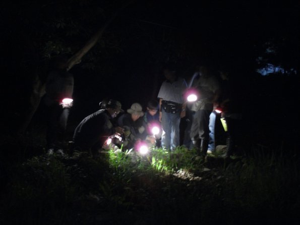 分享束後,蛙蛙始行查,今天加的人15位;因此不分,大家跟著黑眶父一起出去。我先由南北池始走,九大行星除了蛙、小雨蛙的蝌蚪,竟然有赤蛙的蝌蚪呢!在南池的生草地上至少超30的黑眶小蛙幼;眼尖的箭毒蛙-愫珍了一德氏赤蛙(母)。到5化池,是小雨蛙的天下,原先唱的不亦乎的蛙乍然停止,
