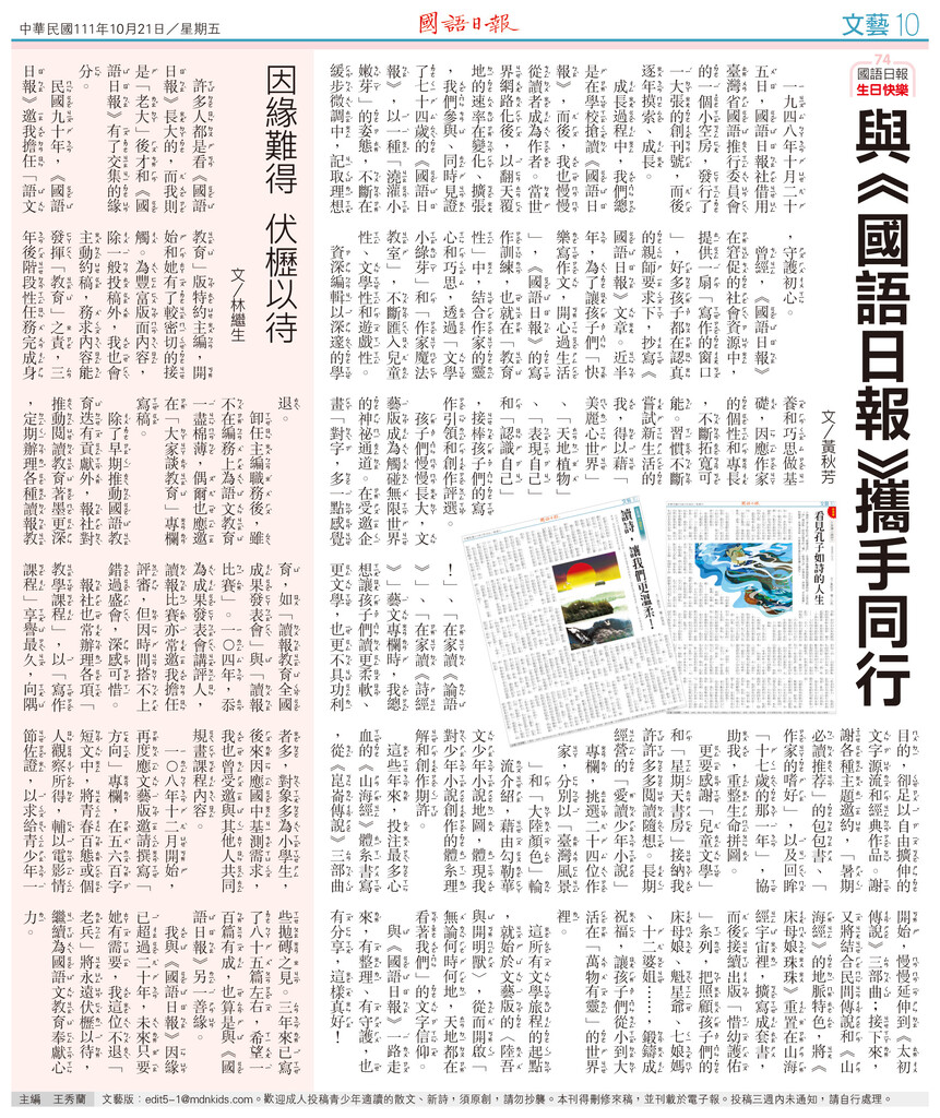 一九四八年十月二十五日,日借到一副缺不全的五注音字模和北平搬的一架四印刷,借用台省推行委的一小空房,行了一大的刊,而後逐年摸索、成。在我的成途中,是在校日,而後慢慢者成作者。世界在路化後,以翻天覆地的速率在化、,我、同也了七十四的日,以一「灌小嫩芽」的姿,不在步微中,取理想,守初心。