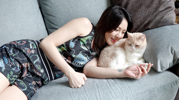 了3的雨柔,沙首抓布材的渥木「Poti波一字型沙」,和毛小孩一起躺著睡、趴著睡也不心。(渥木/提供)