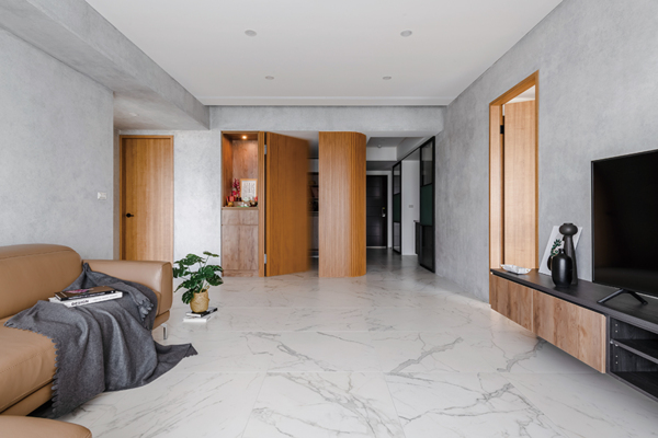 光穿落地窗柔和地室,替客增添通透和明亮,上一口皮沙、吊和,空瞬多了人的度,更馨。光毫障地散落在各角落,光石英地微微反射窗光,面淡合宜的清水模漆映出恰到好的感;而木色框、片和木格灰色的空睛,平衡掉清冷氛。