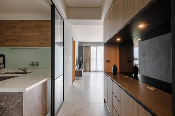 回家的微型之旅,就深色的走道展。左手的房上三段式玻璃拉,片中央安面玻璃,有效地避免直房的感,也巧烹和其他域作分界;右手的是玄的置物,同身兼面房的餐和酒水放置,大面黑玻彷空,倒映淡灰色的清水模面,揭示接下即遇到的野框景。深色走廊明朗光亮的北增添次感,每一次回如穿越隧道,最回到那名「家」的桃花源之境。