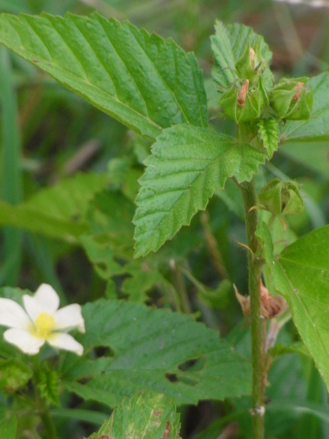 特性:多年生灌木草本,原美洲。直立高50~90公分,全株散生毛及星毛,互生,托,身卵形或卵披形,不整的,面疏生毛。花朵腋生,3~6公分,乳色披形。果果,由8~12心皮所成,心皮形,具粗毛。生於荒地或路,在澎湖地量多,生命力亦。