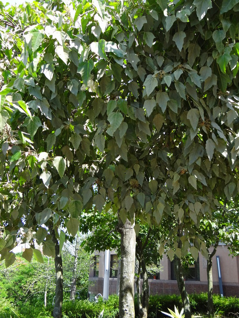 常木,高可 30 公尺, 30~60 公分,通直,皮灰褐色,小枝、幼及花序密生星毛茸。生,互生,具柄,卵三角形或卵形, 12~25 公分, 6~15 公分,先端尖或尖,基部或略心形,或厚,全,不分裂或 3~5 裂,基生的 3~5 主;柄 15~28 公分,柱形,先端有二枚褐色腺。花多,白色,放 1~1.5 公分,呈生的花序;花序 10~20 公分,有多的分岐,同一花序上常雄花及雌花存;花萼形,先端 2~3 裂,小;花瓣 5 枚,形或舌形, 0.8~1 公分, 0.4~0.5 公分,先端,面基部有毛茸;雄花中雄蕊 20 枚左右,排成 4 列;花向;雌蕊的子房扁平卵形,二室,具有毛茸;花柱 2 枚,深 2 裂,分岐成尖。果球形至卵形,略扁平, 5~7 公分, 4.5~7 公分,先端,有毛茸,有子 1~2 枚;子硬, 3~3.5 公分,灰褐色。