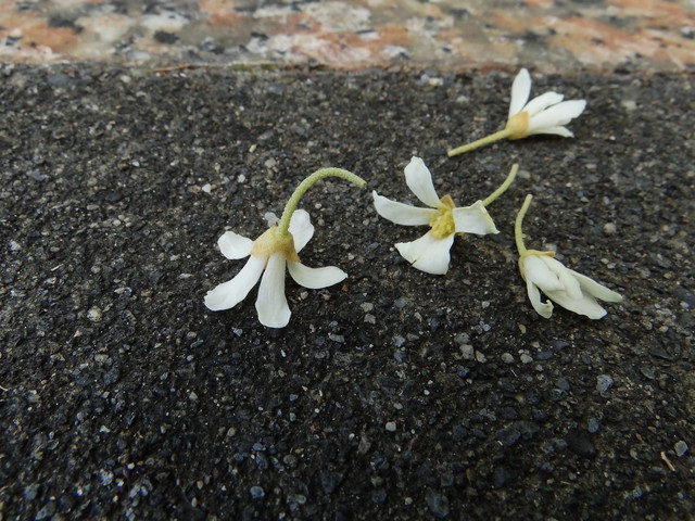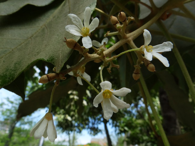 花: 花多,白色,放 1~1.5 公分,呈生的花序;花序 10~20 公分,有多的分岐,同一花序上常雄花及雌花存;花萼形,先端 2~3 裂,小;花瓣 5 枚,形或舌形, 0.8~1 公分, 0.4~0.5 公分,先端,面基部有毛茸;雄花中雄蕊 20 枚左右,排成 4 列;花向;雌蕊的子房扁平卵形,二室,具有毛茸;花柱 2 枚,深 2 裂,分岐成尖。