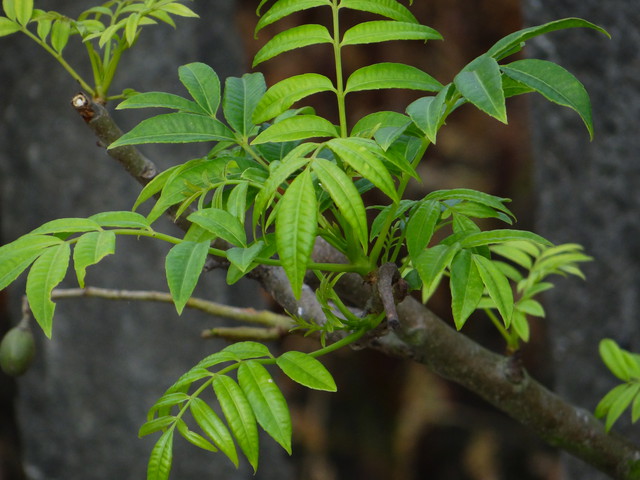 : 嫩赤褐色,奇羽,簇生於老枝端,常 20~45 公分,形,基部肥大,色,光滑,小生,7~25 枚,少 5 枚,片卵形,乃至形,先端短尖,基部或, 8~12 公分, 2.8~-4 公分,下部小 6~8 公分, 2.2 公分,表面色,有光,面淡色,面均光滑,中肋面均隆起,而密,深至近,各所接,具波疏,小柄 0.4~0.6 公分,先端小柄可 1~2.5 公分,折柄,出一橄脂香。太平洋雨林植物,有「瞬落」的象,在短把老落光,同萌新。