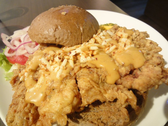 蜂蜜芥末腿堡酥炸腿,吃起口感酥脆,若是不吃牛肉的人, 就可以一道,不然就是加把牛肉成肉,像花生牛肉堡就可以成花生腿堡,然福也有其他口味的堡或是三明治..等餐.