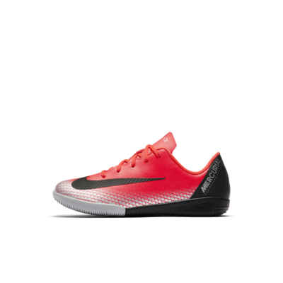 Nike Jr. MercurialX Vapor XII Academy CR7 小童室內/球場足球鞋能給予雙足絕佳包覆,帶來持久舒適與超凡控球感受,無痕外底可在各種室內場地上發揮十足抓地力,助小小球將展現強勁爆發力。