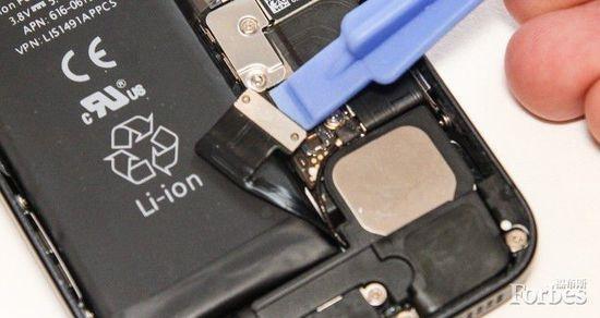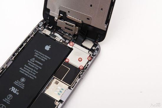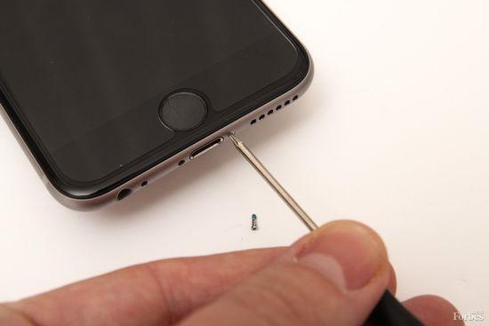 第3步:掉手源,使用工具包的五角形螺刀下螺。螺刀的部很小,但它跟 iPhone 6底部的小螺是匹配的。