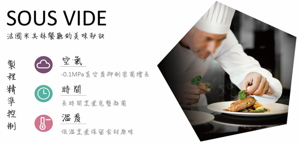 Sous vide 中「舒肥」,源自70年代法的烹方式,食材以均受,保存其水分分,兼健康美味的新一代料理手法。