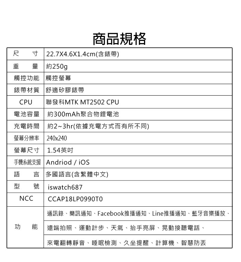 ★ 心率、睡眠 ★Line息推播,抬手屏(需到手定) ★ 牙,卡路里消耗