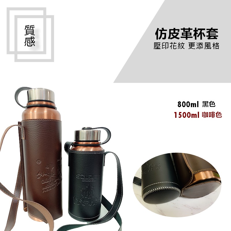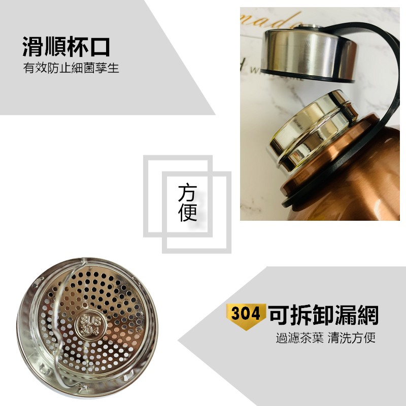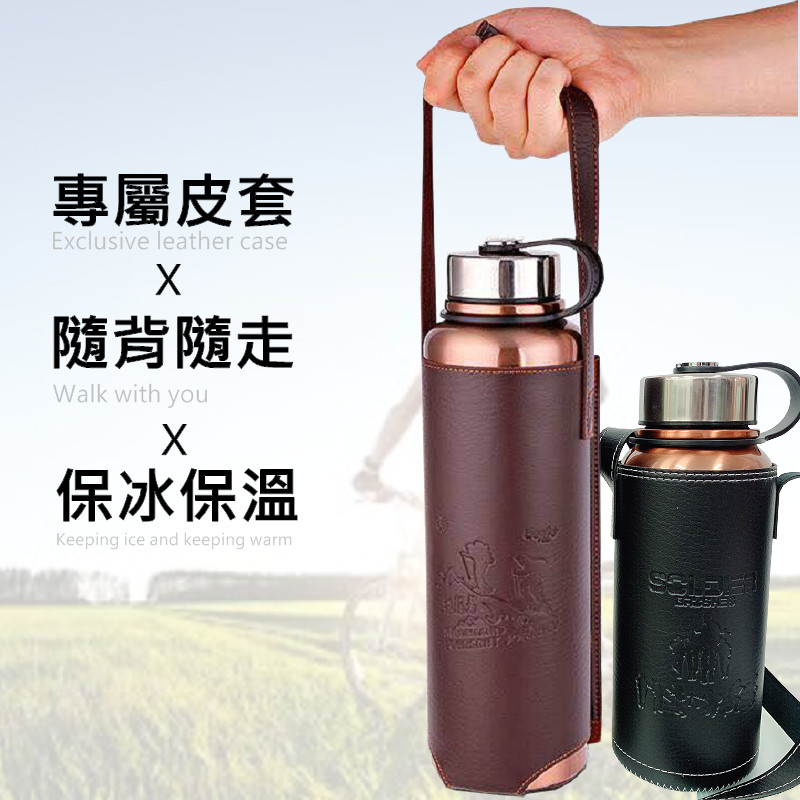瓶身用食品304不,一成形香金,住度不流失,不生、耐腐、水垢,茶可拆卸,防滑耐磨底座,大口瓶口清洗方便,仿皮革皮套方便提升感。