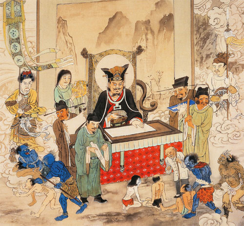 此宋帝王正盛怒判一群劣不孝子女,忘恩家逼死老父的案件。先由地城隍提,又有判官查察司,令罪犯百口莫,伏首罪情形。