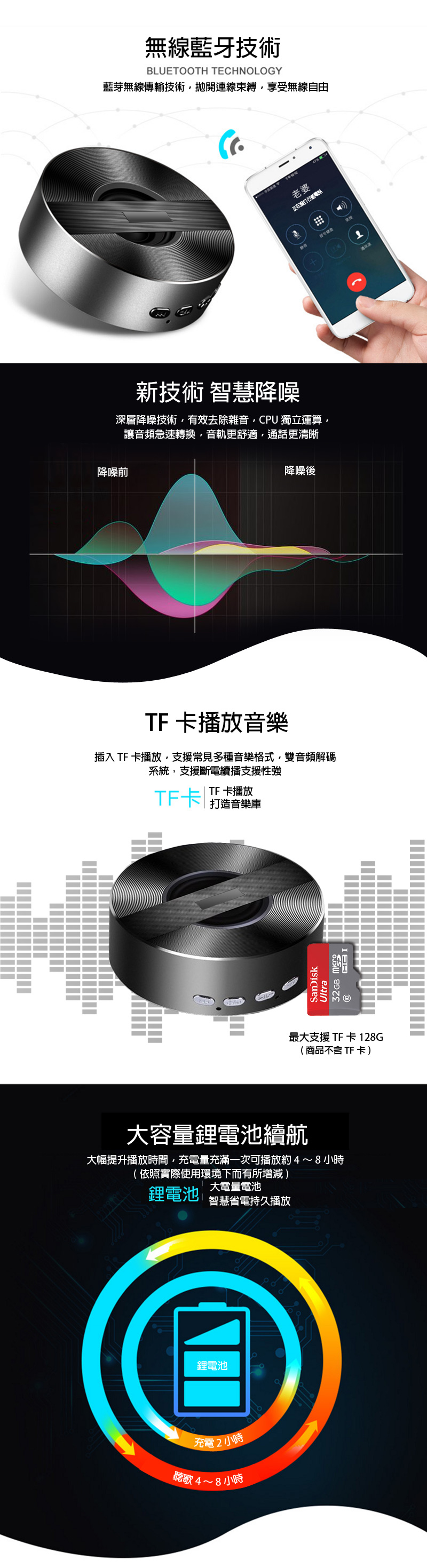 ●外接TF卡最大支援128G,可播放多音格式,打造音