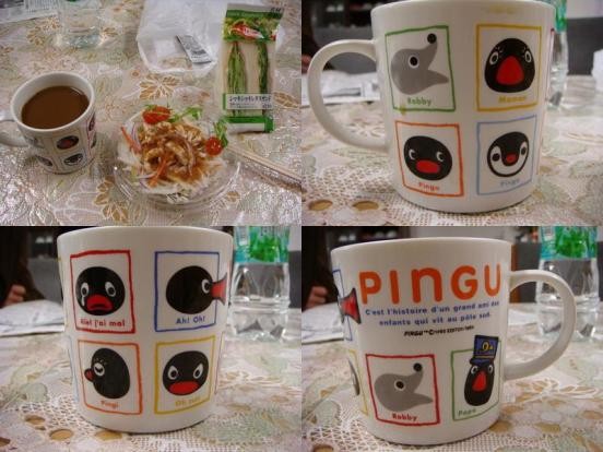 天的早餐是7-11的三明治(¥210)和生菜沙拉(¥180 + 23),得啊,在日本生菜沙拉是「不」附汁,所以汁要用的,真不便宜……民宿提供即溶咖啡和牛奶,正好看到可的mug,它照了一圈照片。其我比喜Pinga,白白的好可,而且是女生;至於杯上的法文,有趣的可以翻看看。