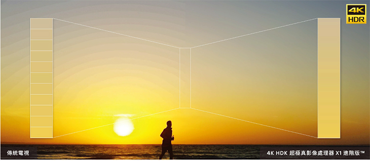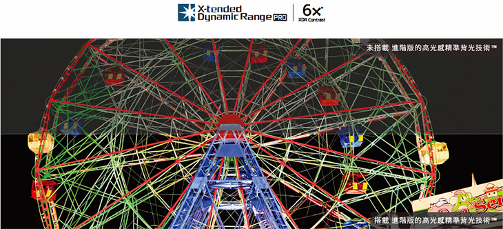 Sony 4K HDR 搭版高光感精背光技 (X-tended Dynamic Range PRO ™ ) 可成高於 LED 6 倍以上的比,比丶光明暗次的化, 能精呈真色,您享受更加接近肉眼所的美夜景、光深邃有次的黑。 |