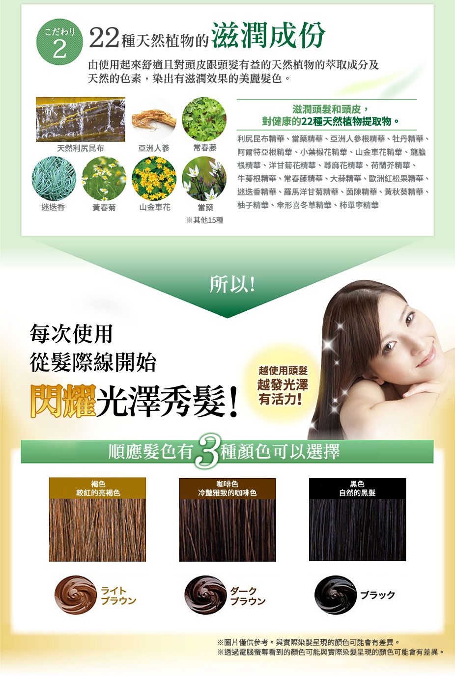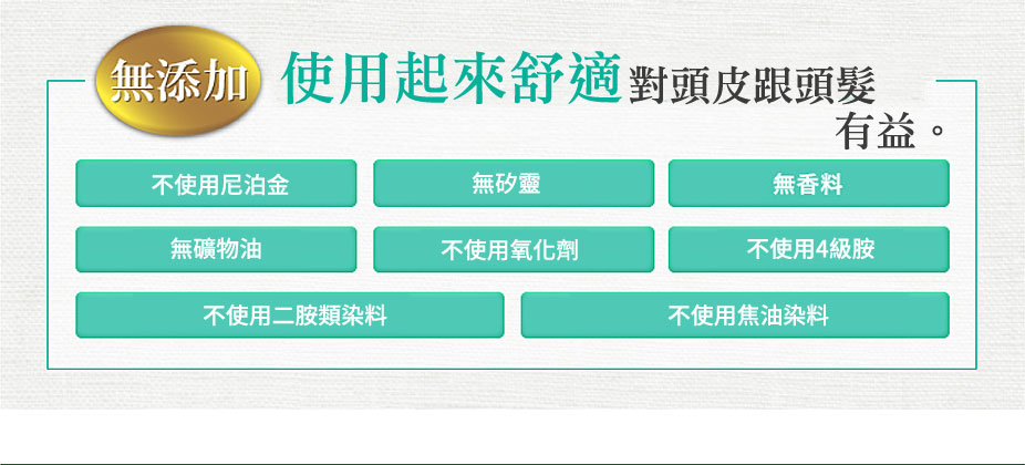 天然,不含化成份PPD,添加矽、防腐、物油、香料、二胺、尼泊金。