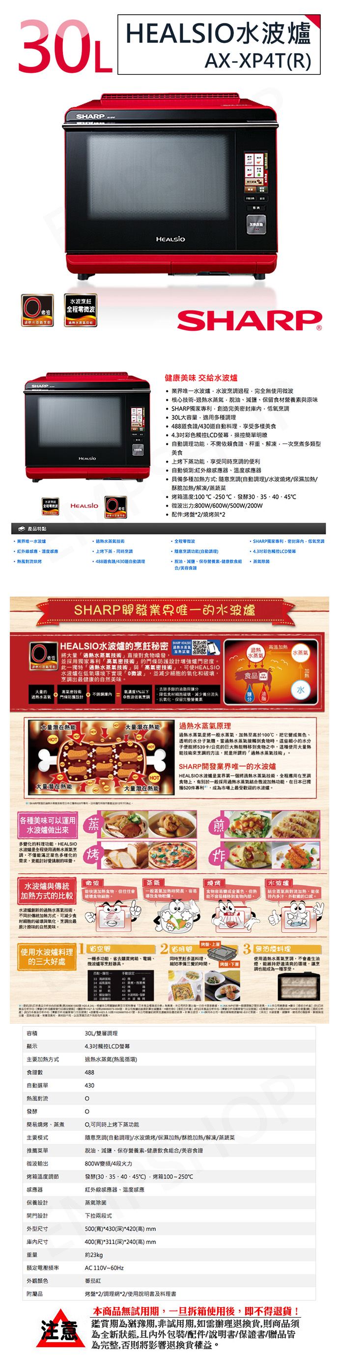 SHARP家利,低氧烹,30L大容量,4.3彩色控LCD幕,水蒸,油、保留食材素原味
