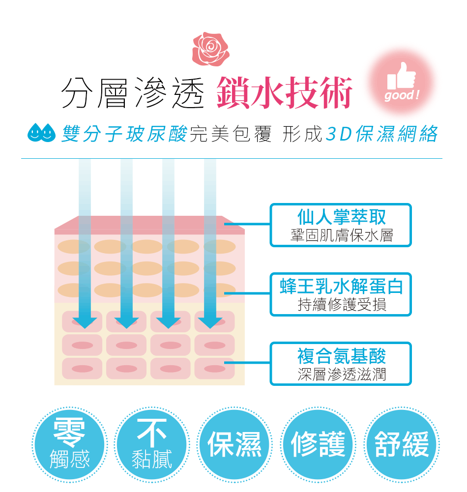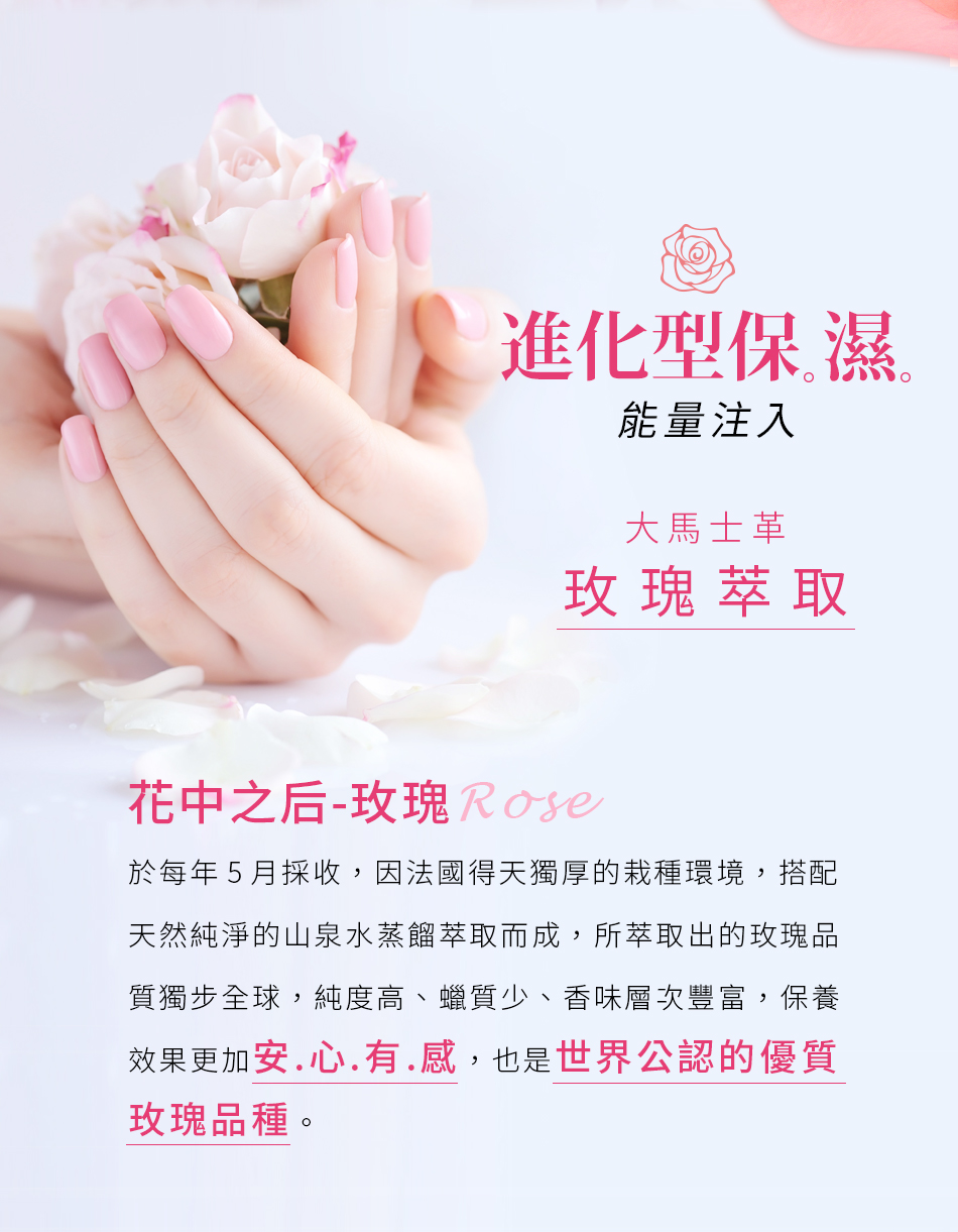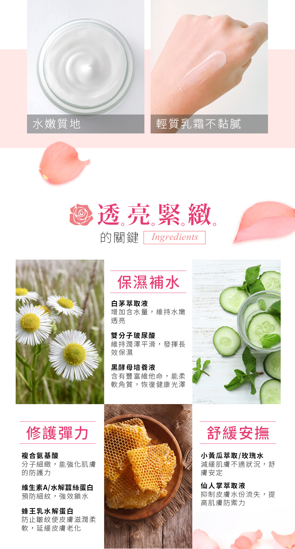 「玫瑰蜂王乳保水嫩霜」用分透的概念,使保因子由小到大表始全面透入深基底, 肌表形成「3D保」,住滋的保成分,成完整的保,肌醒的高能水凝霜,醒青春原力!