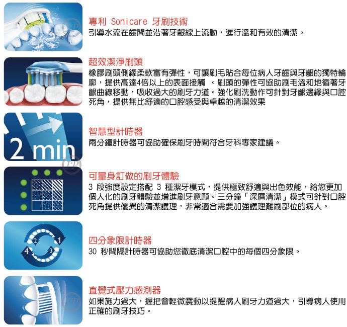 ? 效能 : 牙菌斑清除效果提高 10 倍,施力大握把微震以提醒病人刷牙力道大,引病人使用正的刷牙技巧!