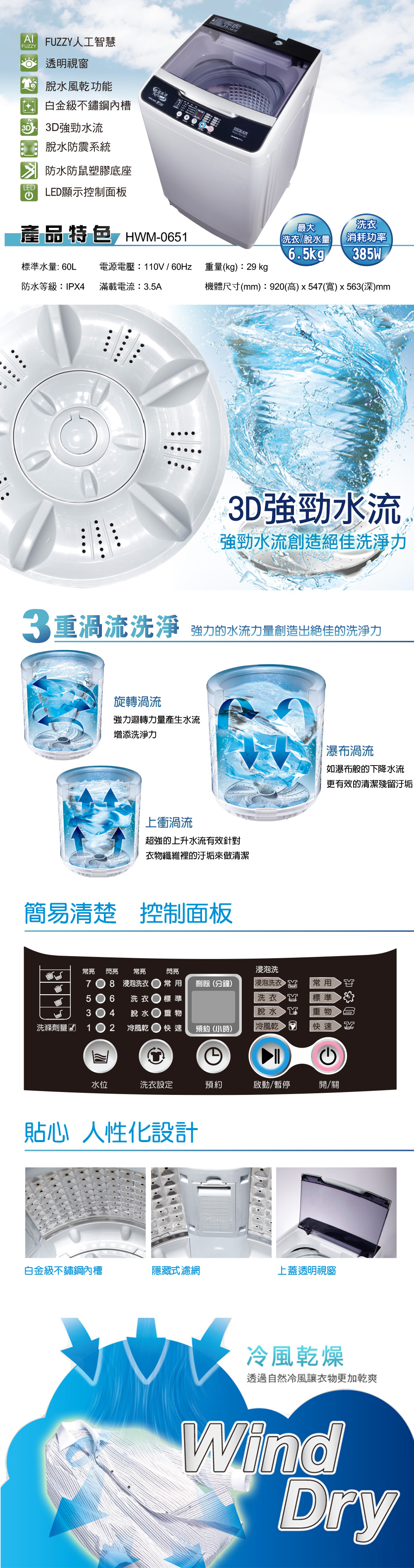 【HERAN禾】6.5公斤全自洗衣HWM-0651 的品介在下面,