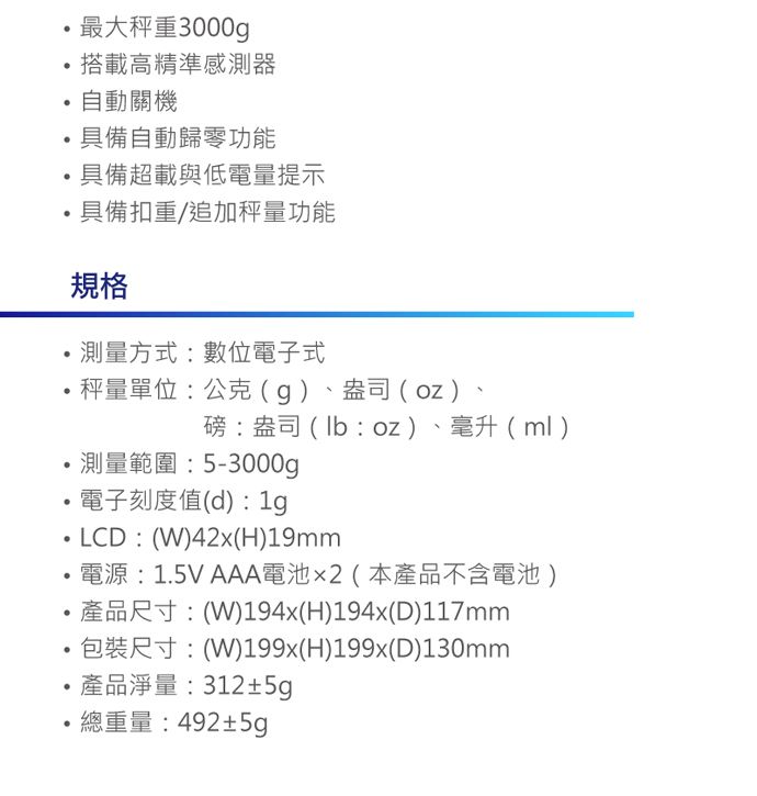 料理必工具,搭配高度化玻璃材、搭高精感器、最大秤重3000g、具自、自零等功能!