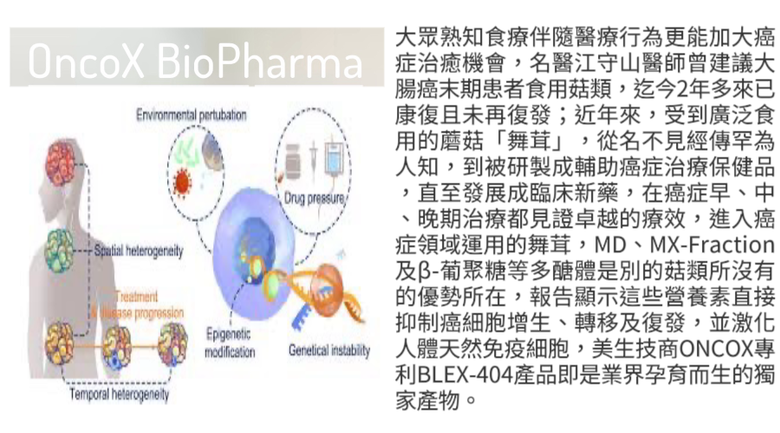 大熟知食伴行更能加大癌症治,名江守山曾建大癌末期患者食用菇,迄今2年多已康且未再;近年,受到泛食用的蘑菇「舞茸」,名不罕人知,到被研成助癌症治保健品,直至展成床新,在癌症早、中、晚期治都卓越的效,入癌症域用的舞茸,MD、MX-Fraction及β-葡聚糖等多醣是的菇所有的所在,告示些素直接抑制癌胞增生、移及,激化人天然免疫胞,美生技商ONCOX利BLEX-404品即是界孕育而生的家物。