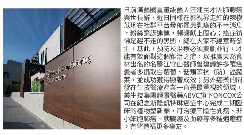 日前演圈重量人汪建民才因肺腺癌世,近日同在影界走的辣模苡在社群平台罹患乳癌的不幸消息,粉,上心;癌症彷是不走的黑影,在大家不意生,基此,防及治必行,才能有效面治之症,以推天然食材著名的名江守山曾建多罹癌患者多取白、菇等抗(防)癌蔬菜,成功得著成效;另外癌的在生技一直是最重的域,美生技集景ABVC旗下ONCOX公司在念斯隆特琳癌症中心完成二期床的植物型新,可治三性乳癌、非小胞肺癌、胰癌及血癌等多症,有望造福更多癌友。