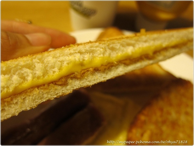 花生乳酪烤吐司、炒蛋、香、培根、薯