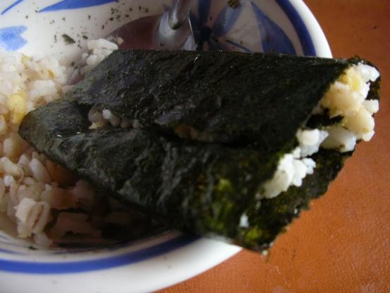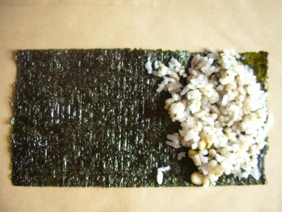 :步二 江海苔起三分之ㄧ或多一些,然後在上方再放少的,主要是海苔可以藉由米的黏性包合起。