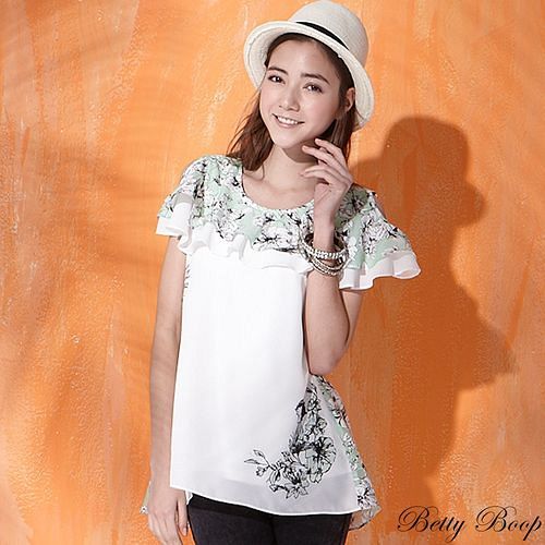 ■BettyBoop蒂水墨花草配色荷挖肩上衣■BettyBoop百■水墨雅■挖肩荷袖更加甜美迷人