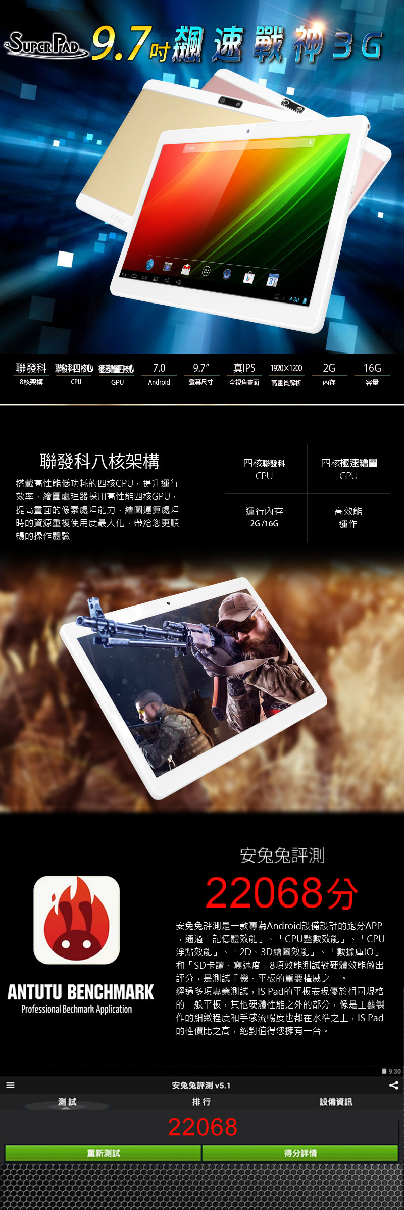 【Super Pad】一般版速神 9.7 3G 科四核心 平板(2G/16GB)1台(含保(已)+器 +USB) ,推,箱,CP值,,,便宜,惠,介,排行,精,特,周年,,限