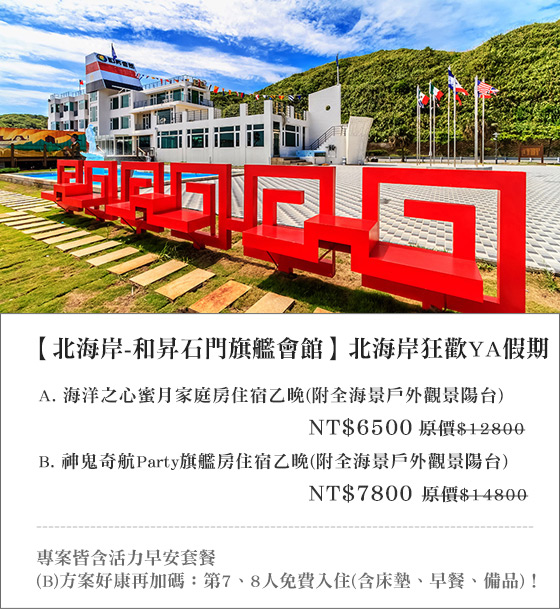 久久放一次假然是要好好的去旅放一下心情但最大的就是住宿的,到底要者哪店或旅比划算又住得舒服又安心!比了一下多家旅跟店後(北海岸-和石旗-北海岸狂YA假期)真的我失望,去到那玩得心住得也安心以下是 北海岸-和石旗-北海岸狂YA假期 的介 如果也跟我一喜不妨看看喔!↓↓↓限量特格按↓↓↓ 商品息描述: ●即即用!在上可以使用,好康不必等!●特式船型建,北海岸全新旅地●地依山傍海,具海第一排地理,一美景●全台唯一「主式餐旅」,以元素打造海包 About Us 北海岸-和石旗座落於新北市石海一之【北海岸石?和旗】,地八百坪,依山傍海;具面海第一排之地理,美景一。以「和之星?用航全世界」主,建北海岸全新地-式船型建。外大型置主,以知名心理家-史登堡所提出之著名的「情三角理」基,搭配「世界三大航」中的九大家特色主,八不同的貌以各典地具呈活,抽象化理具象化大型置合之意想。先看最便宜主餐置以船格主,全台唯一「主式餐旅」;海包合世界各特色元素不同情。由「台最北疆-石」出世界,和匠心呈,致力旅客一段忘的海洋之旅。Rooms 房型介海洋之心蜜月渡假房 神鬼奇航party旗房Scenic Spots 周景石老梅位於北海岸石老梅里的石槽海岸,全台唯一特殊景,些排列整的石槽,是由於大屯火山爆後,留海岸的火山礁岩,在波浪期的刷下,地的部份被侵,留下硬的部份而形成槽,人不禁感大自然的神秘。朱美座落於山林的朱美,完整典藏了人朱生的作及的著。朱初在金山地,粹只是了解大型作品存放的,意外矗立於地中的雕塑具味,因此引他打造一座美的心。全地十一甲,收藏展示朱先生各期作,五百件平面作,五百件立雕塑,些斐的作品,列於青草地、天的外展,每件作品都能各得其所、各有所,呈最生的姿。朱的作依格主要分三系列:「土系列」、「太系列」、「人系列」,些作品或依其期,或依其的特安排於的各。金山里老街(金包里街)目前台少老街之一,老街旁建物多已改建,少部份外仍保留原的子,像理店、古玩的店,不著名且皆具特色。位於金山老街(金包里街)尾安前的肉,更是,生意之好,已展成整街左右舍十的一皆其所借用,而逢例假日更是一位求,饕客之若。台台是多到山的客不的天然美景,原本是金山岬的一部分,後因海水及不地侵果,下方的海洞逐穿成海岬,形成似石的海拱,後海拱部崩塌,形成座海石柱形的礁,外形像座,所以被「」。 商品息述: 只要6,500元起即可享有【北海岸-和石旗】原最高14,800元北海岸狂YA假期:(A)海洋之心蜜月家庭房住宿乙晚(附全海景外景台)/(B)神鬼奇航Party旗房住宿乙晚(附全海景外景台),案皆含活力早安套餐。(B)方案好康再加:第7、8人免入住(含床、早餐、品)?