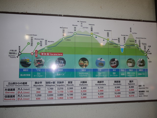 DAY2:金~立山峰北立山黑部多交通工具:立山【】~美女平    高原巴士】~室堂秘境之湖散策(高山草原景雷之)【隧道巴士】~大峰【空中】~黑部平【黑部地下】~黑部湖【徒步】~黑部谷水【山路巴士】~扇~白