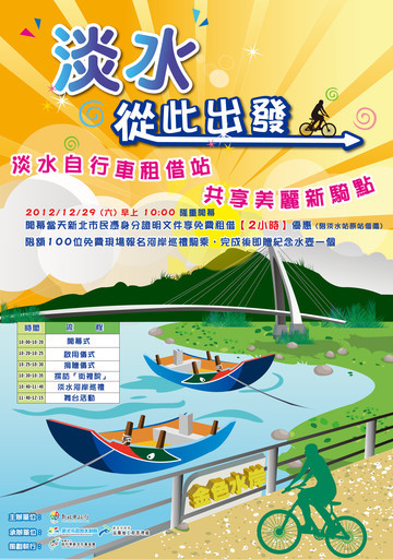 淡水租借站位於淡水捷站後方,金色水岸自行道,於101年12月29日(星期六)上午10行幕活,新北市政府高地工程管理及法人自行新文化基金行珠也到盛,法人自行新文化基金提供75自行捐予新北市境4育幼院,育幼院代表亦出席活。