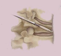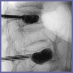 在局部麻醉下,利用可整的X光找到的入,把一枝4mm治扎入椎,注入人工骨泥