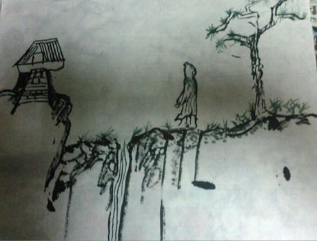 一松之人 , 山岩中有小瀑布 , 附近有一小塔 .....