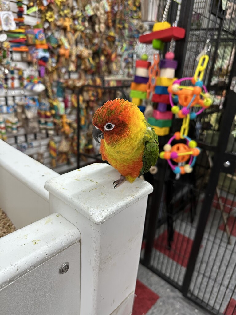 的格也很人, Nansun Conure,是 Sun Conure Nanday Conure 的混,非常漂亮,但是要七百美金。我照片 C,他拿 Yoda 去,被我拒。我百美金,也不!