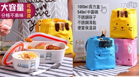 ● 1000ML三格陶瓷方盒+540ML陶瓷碗+保不筷+匙+卡通保袋