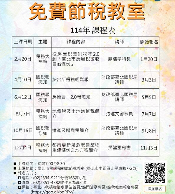 教室推出系列租程,包含地方及知介、最新政策、今年合所得定,且房地合一2.0、都市更新及危老建物重建等,全都提供相,意者:(02)2394-9211分163。【台新生】2025/02/08