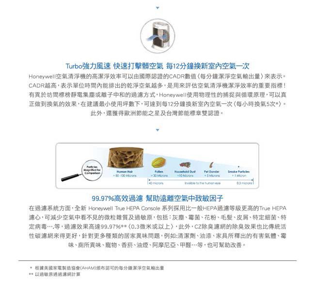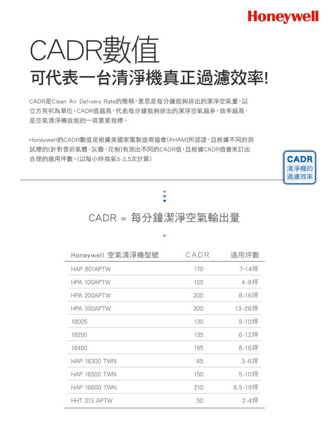 在美,Honeywell空清的空出量CADR (Clear Air Delivery Rate) 值受到美家造, CADR值越高, 代表每分可出的空量(立方英)越多,才真正代表一台空清的能力。在最小建使用坪下, Honeywell空清可以到每12分更新室空一次(每小5次)