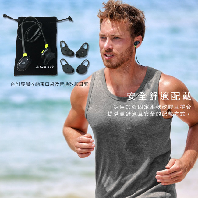 用耳式柔矽耳套,提供舒且安全的配戴方式,配收束口袋。