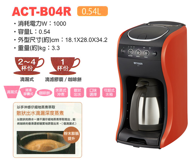 【TIGER虎牌】蒸汽滴漏自咖啡 ACT-B04R (附不咖啡) ,推,箱,CP值,,,便宜,惠,介,排行,精,特,周年,,限