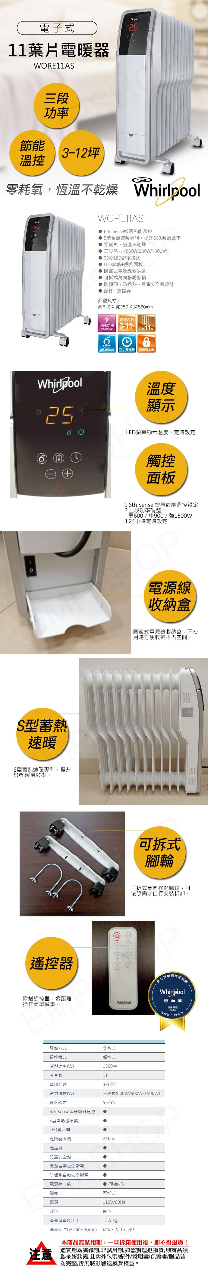 【惠而浦Whirlpool】子式11片暖器 WORE11AS 的品介在下面,