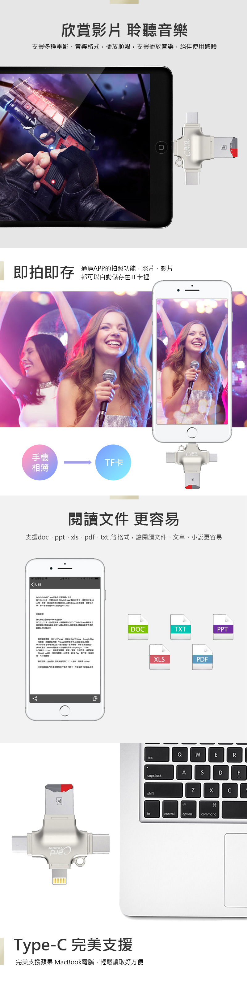 ★ 四孔插槽:Lightning、MicroUSB、Type-C、TF卡插槽/USB