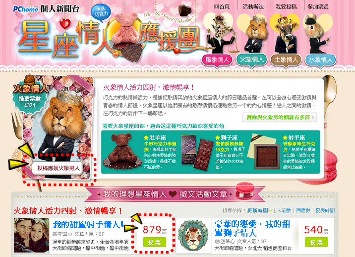Step2:按下我要援登入新台表「我的甜蜜XX情人」文章,援你喜的星座情人,呼叫朋友你的文章投票,票占比成的50%,票越高得越高!!