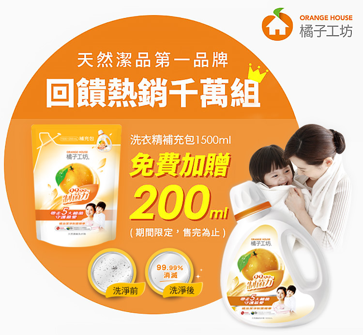然有好康的要大家,而且在是小妹精挑【橘子工坊】天然洗衣精充包-制菌力99.99%(1700ml)比後的果,
