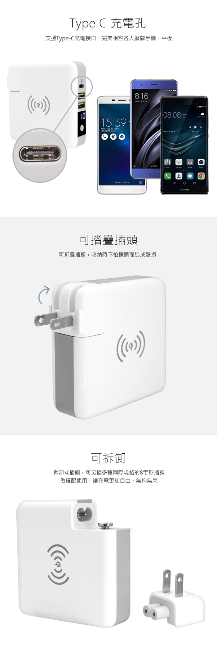 ★ 2孔USB+1孔Type-C+Qi Wireless 最多可4部手充