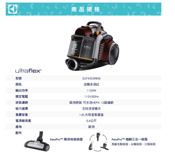 【Electrolux伊克斯】洲原 Ultraflex 通道旋吸器 ZUF4303REM (送吸) 的品介在下面,